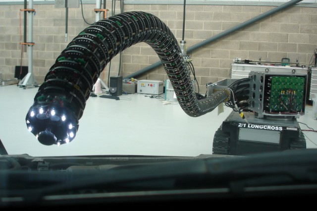 巨大なヘビのようなロボットは、3メートル以上の長さを持ち、180度以上に曲がる非常に柔軟なつくりになっている。