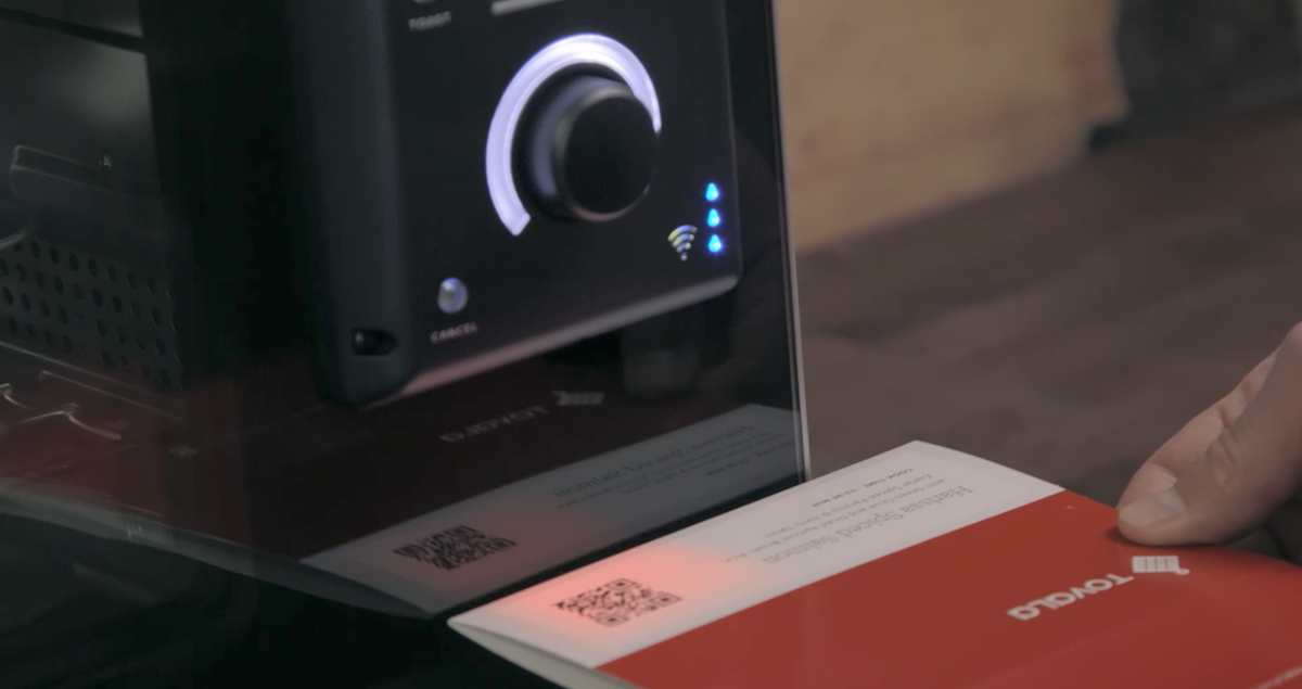 あらゆる調理を一台でこなす万能オーブン「Tovala」は、すべての食材が整った状態の専用食事パッケージが家まで宅配され、それらをオーブンに投入、QRコードをオーブン本体にかざしてスタートボタンを押すだけで、凝った家庭料理が完成するという。