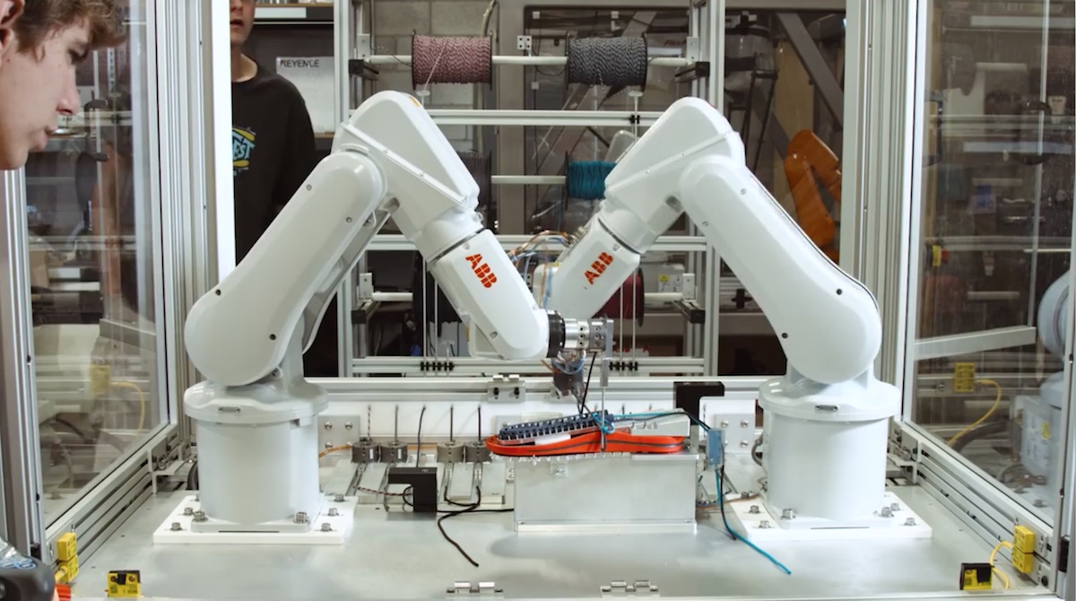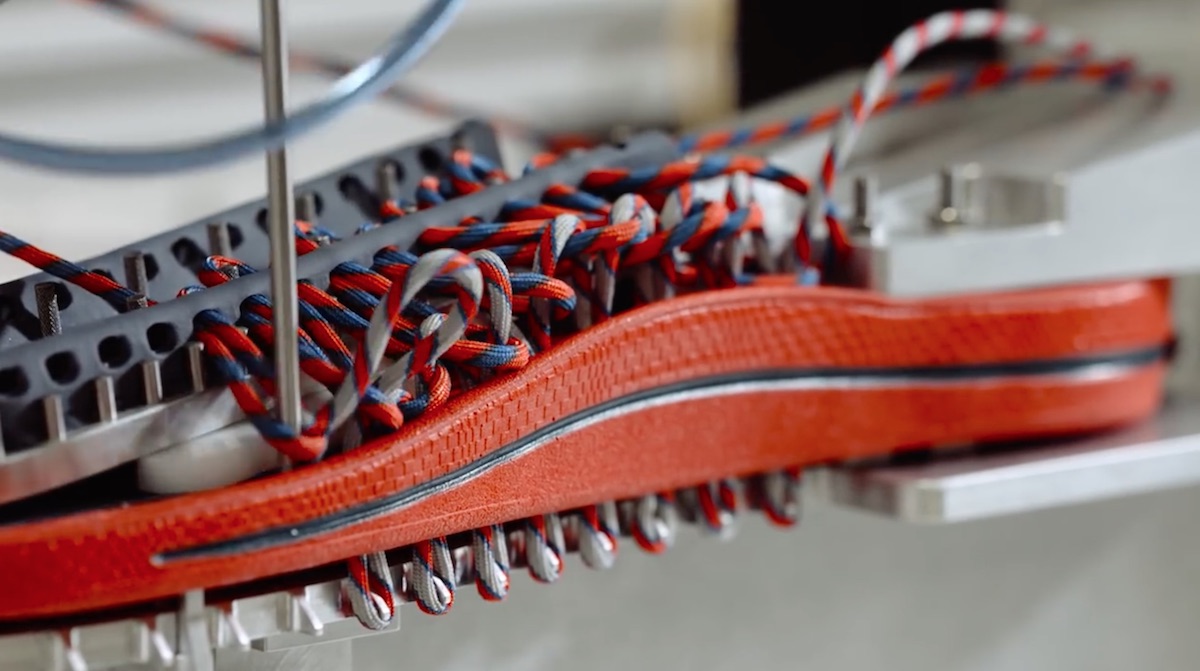 このロボットはプログラミングされた内容に従い、アームを器用に動かし一部の製造工程を自動でこなすのだ。具体的には、2本の紐とソールをあみこみ、紐の色も糸巻きから選ぶことができるのだ。