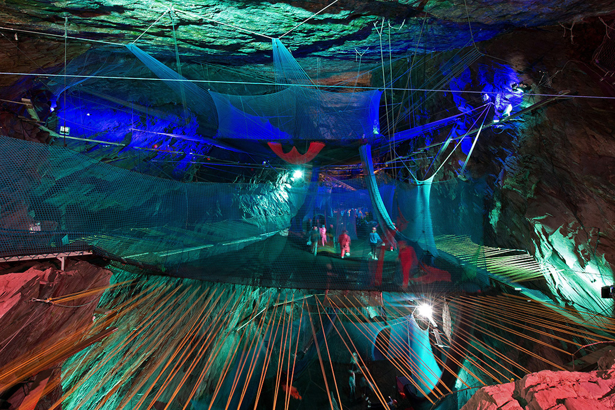 「Bounce Below」は、閉山した鉱山の跡地を利用し、洞窟内に「ネット」を張り巡らさせた施設である。さらに洞窟内をカラフルなLEDで照らし、観光客は非現実的な空間の中を、思う存分飛び跳ねて遊ぶことができるのだ。