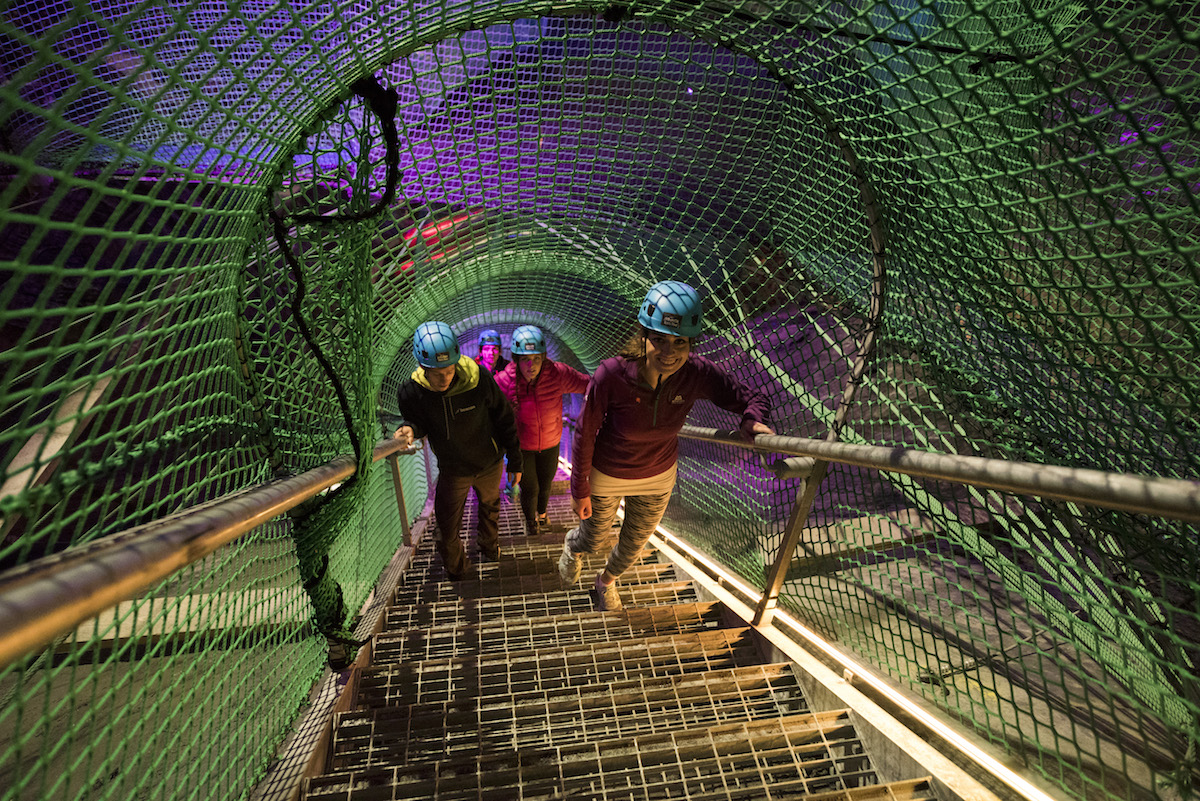 LEDライトで幻想的に照らされる洞窟内に張り巡らされたネットの姿は、まるで巨大なクモの巣のようで圧巻だ。この壮大の景色の中で飛び跳ねていると、徐々に恐怖心が薄れ、今まで味わったことのない世界を味わえるかもしれない。