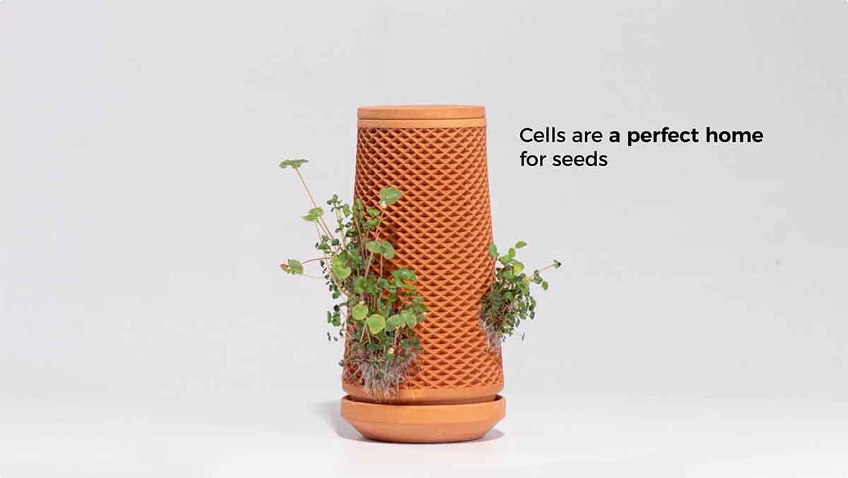 中央に入れた水がひし形のくぼみを通してゆっくりと染み出してくることで、植物は育っていく。この構造のおかげで、水やりの頻度も減らすことができる。