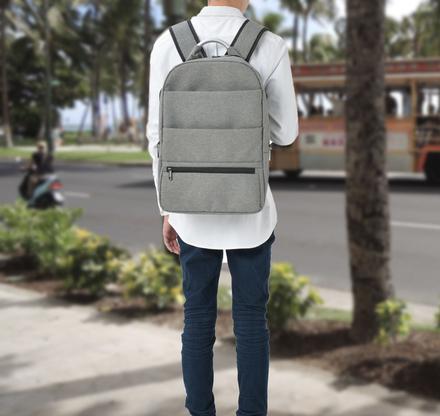 バッグは縦長で背負ったときに後ろへのふくらみを抑えた設計だ。15.7インチのパソコンが簡単に入るサイズで、書類や小物もサイズに分けてスッキリ収納できる。バッグの外側にはホルダーがついており、ペットボトルや折りたたみ傘入れとしても使用可能。使いやすさをを重視した機能的なデザインだ。