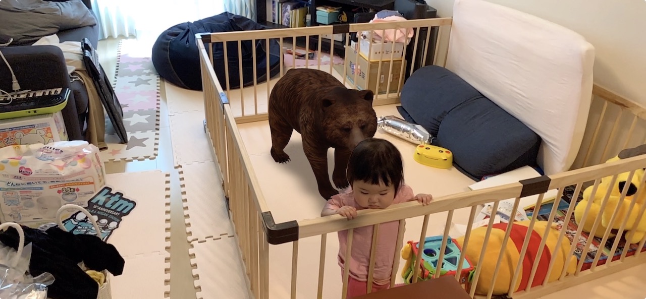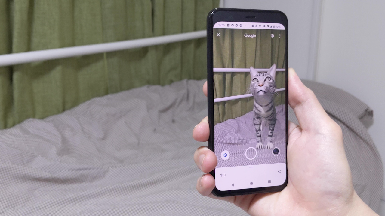 検索結果の一覧をスクロールしていくと、「3D表示」のボタンがつ見つかるので、タップすればOK。スマホカメラを通して、部屋の中に動物が出現します。