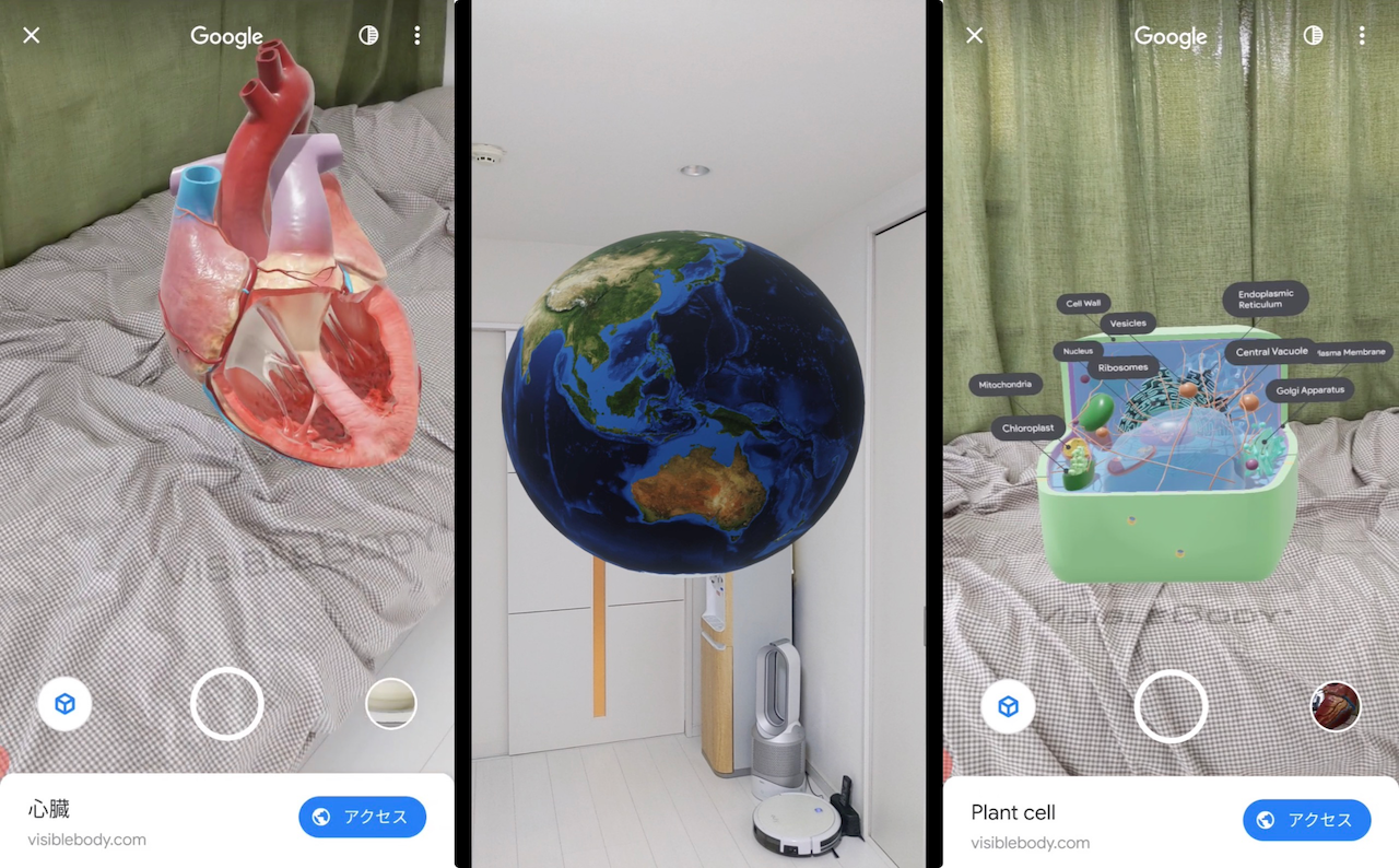 動物の3D表示は2019年から行われていますが、さらに3Dデータを持つサイトがAR検索の取り組みにテスト参加しています。例えば、NASAからは惑星などのデータが提供され、「土星」「木星」「地球」などを3D表示できました。