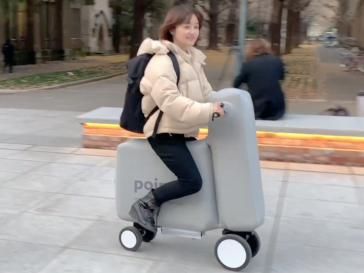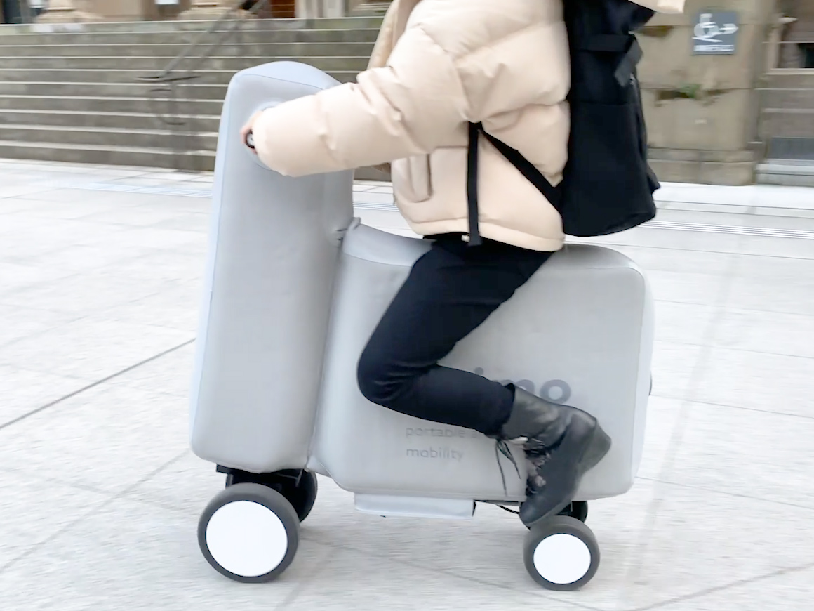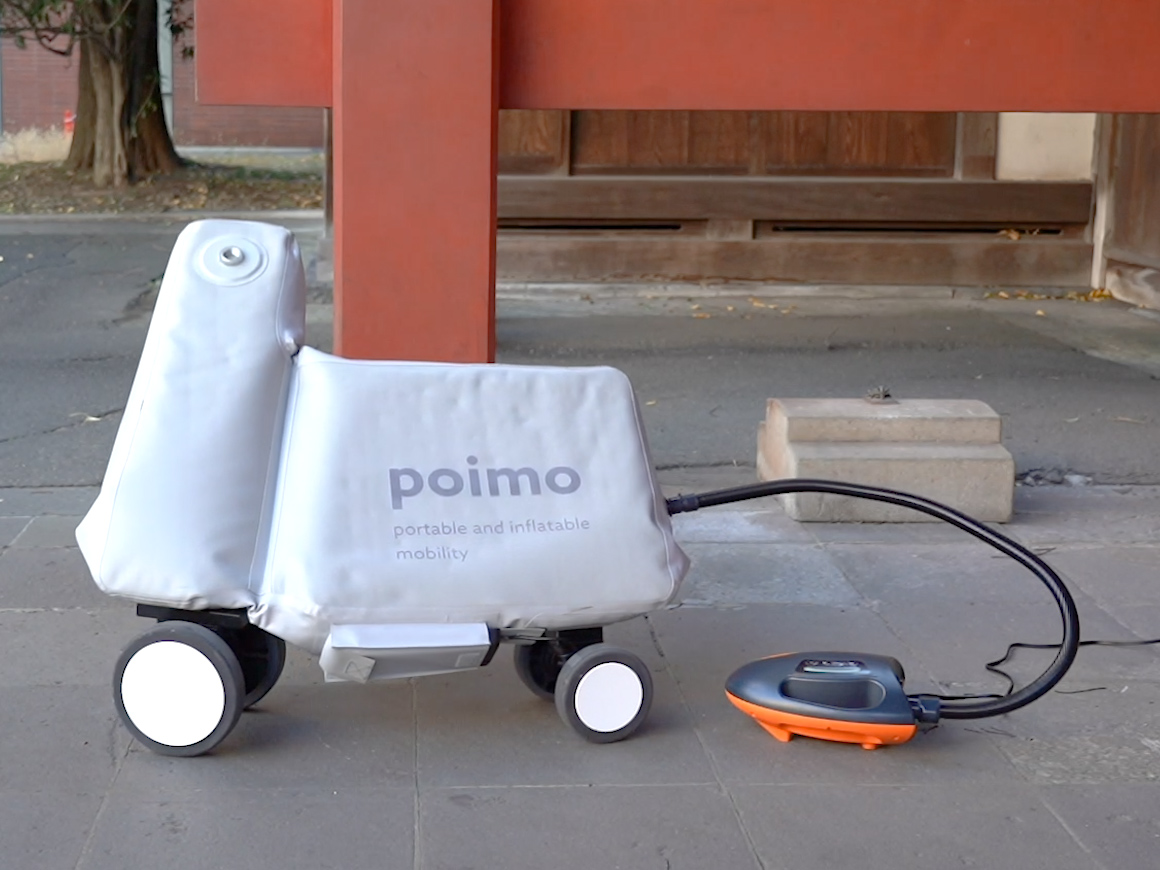 なんて時に、そのラストワンマイルを繋いでくれる持ち運べるモビリティが開発された。「poimo」は空気をふくらませて乗る電動モビリティ。空気を膨らませることでボディの剛性を保ちつつ、軽量化を実現している。