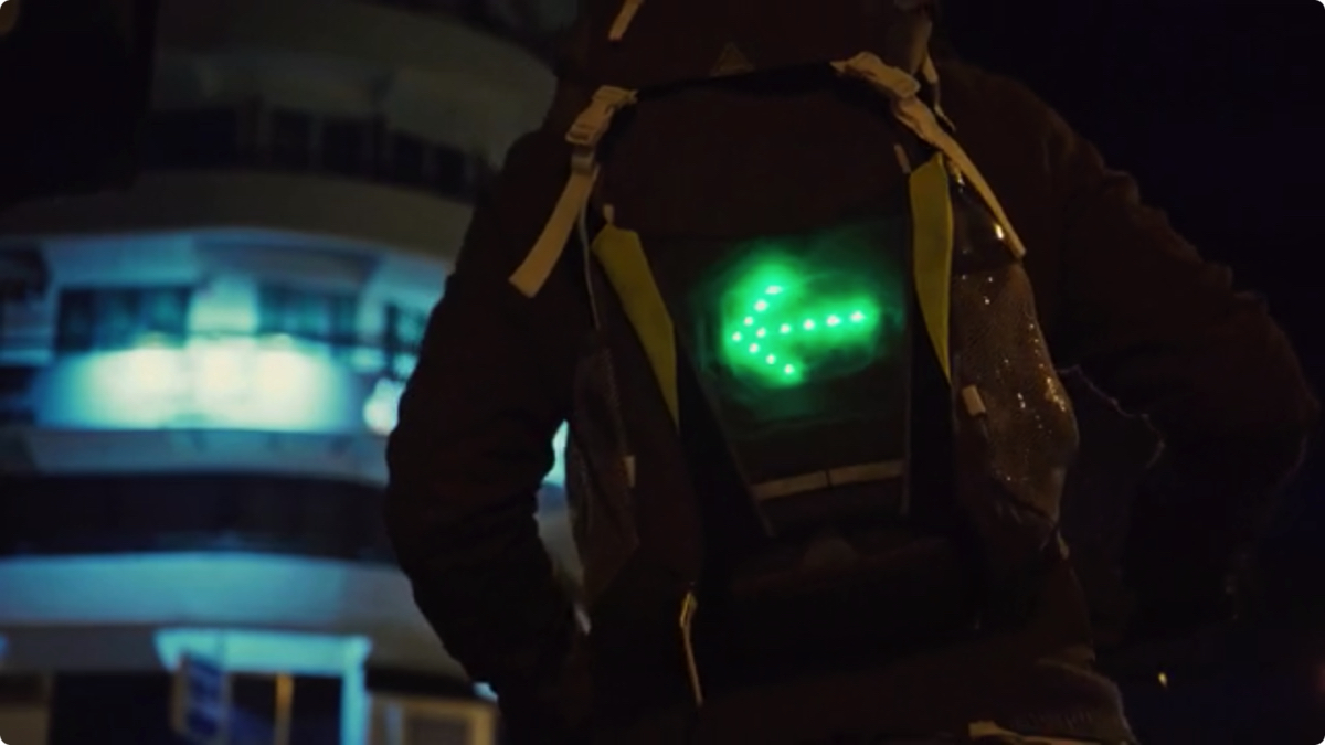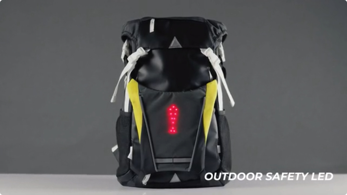 本体表面にLEDライトを搭載し、背後の車や人に指示キーが表示できるセーフティバックパック「INDIEBAG」。収納も多いので、自転車での移動が多い学生や会社員の方におすすめのアイテムだ。