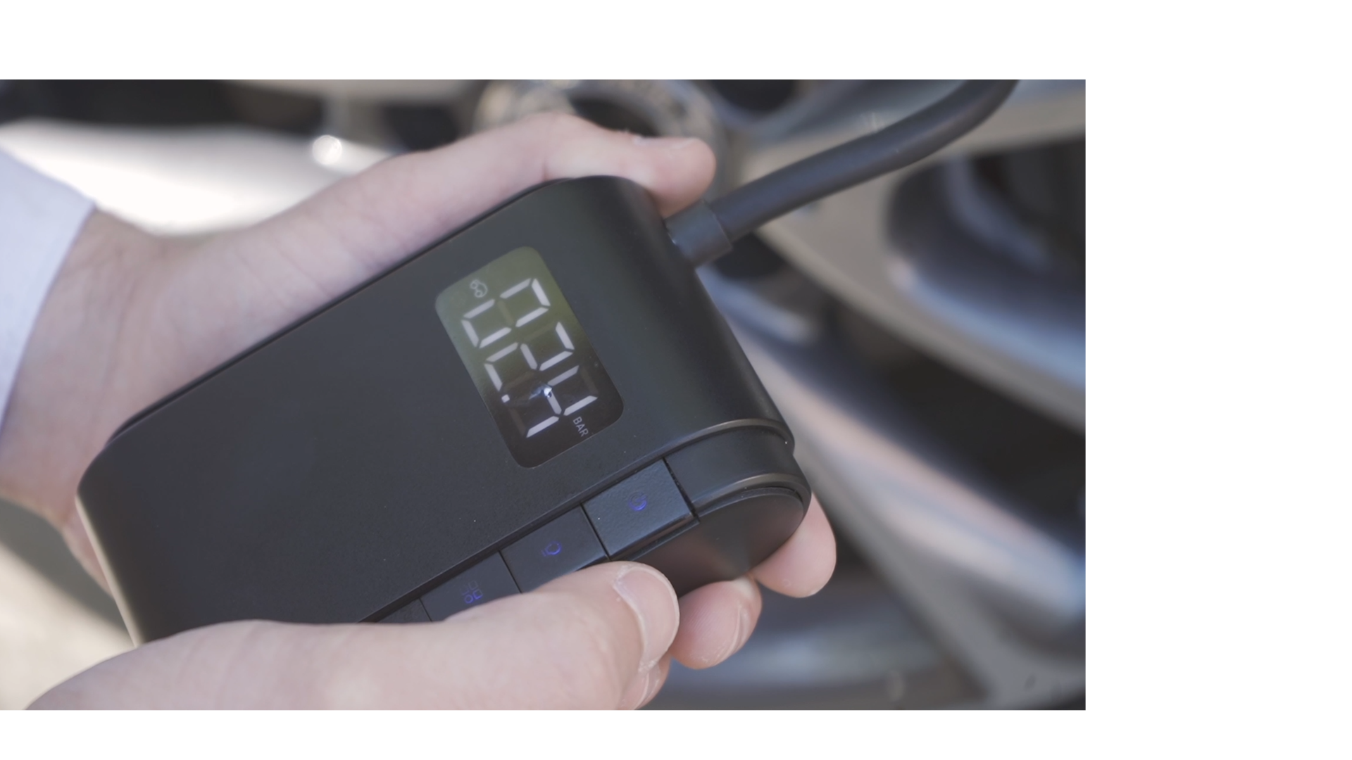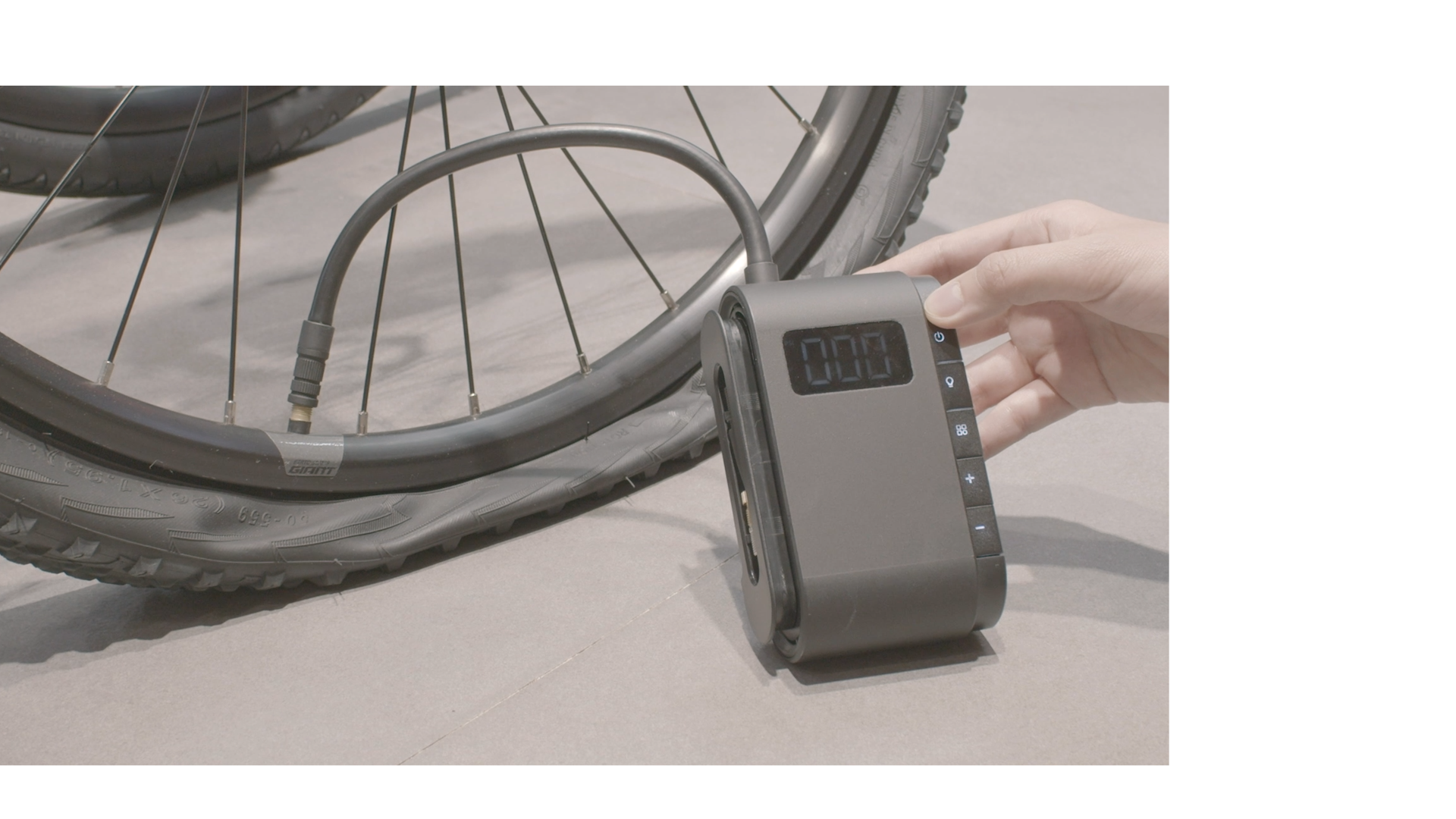 付属のホースで本体とタイヤやボールをつなぎ、ボタンを押すだけで空気の注入が行える。注入した空気量を検知して動作が自動的に止まるため、空気を入れすぎる心配もない。
