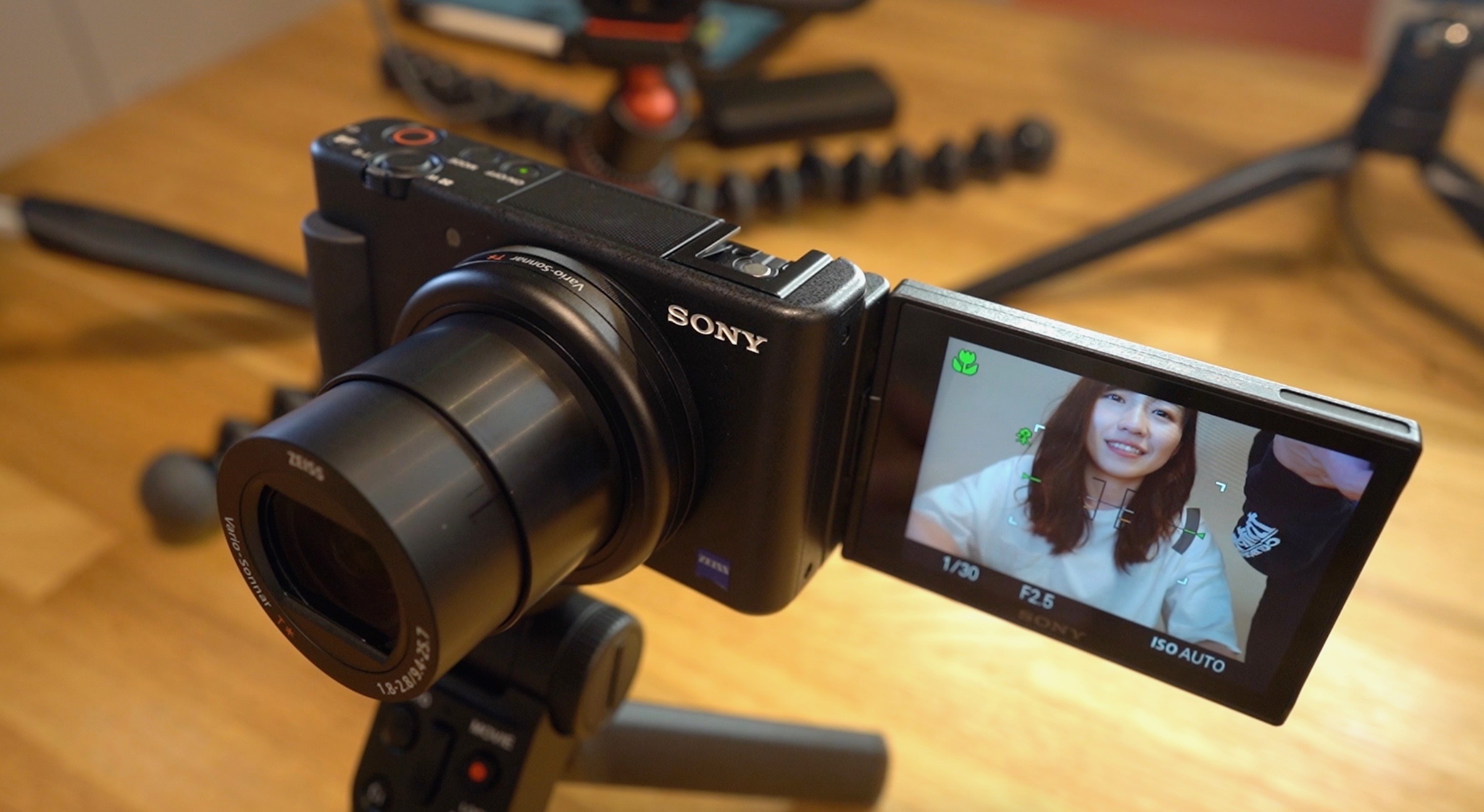 これまでは、モニターが上下に開くカメラが多く、自撮りの際に目線が大きくずれてしまうのが少し残念だったが、「ZV-1」はレンズの真横に液晶がくるため、あまり目線もずれず自撮りができるようになったように思います。