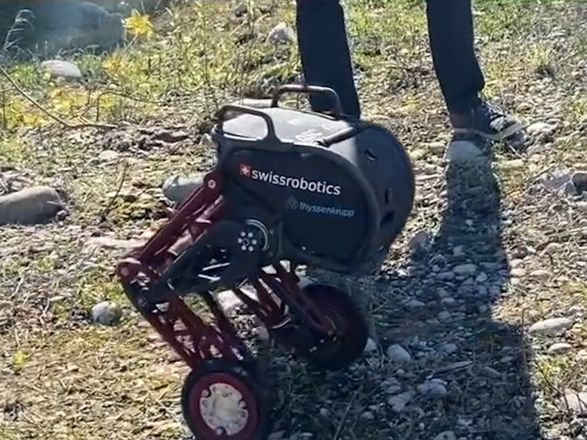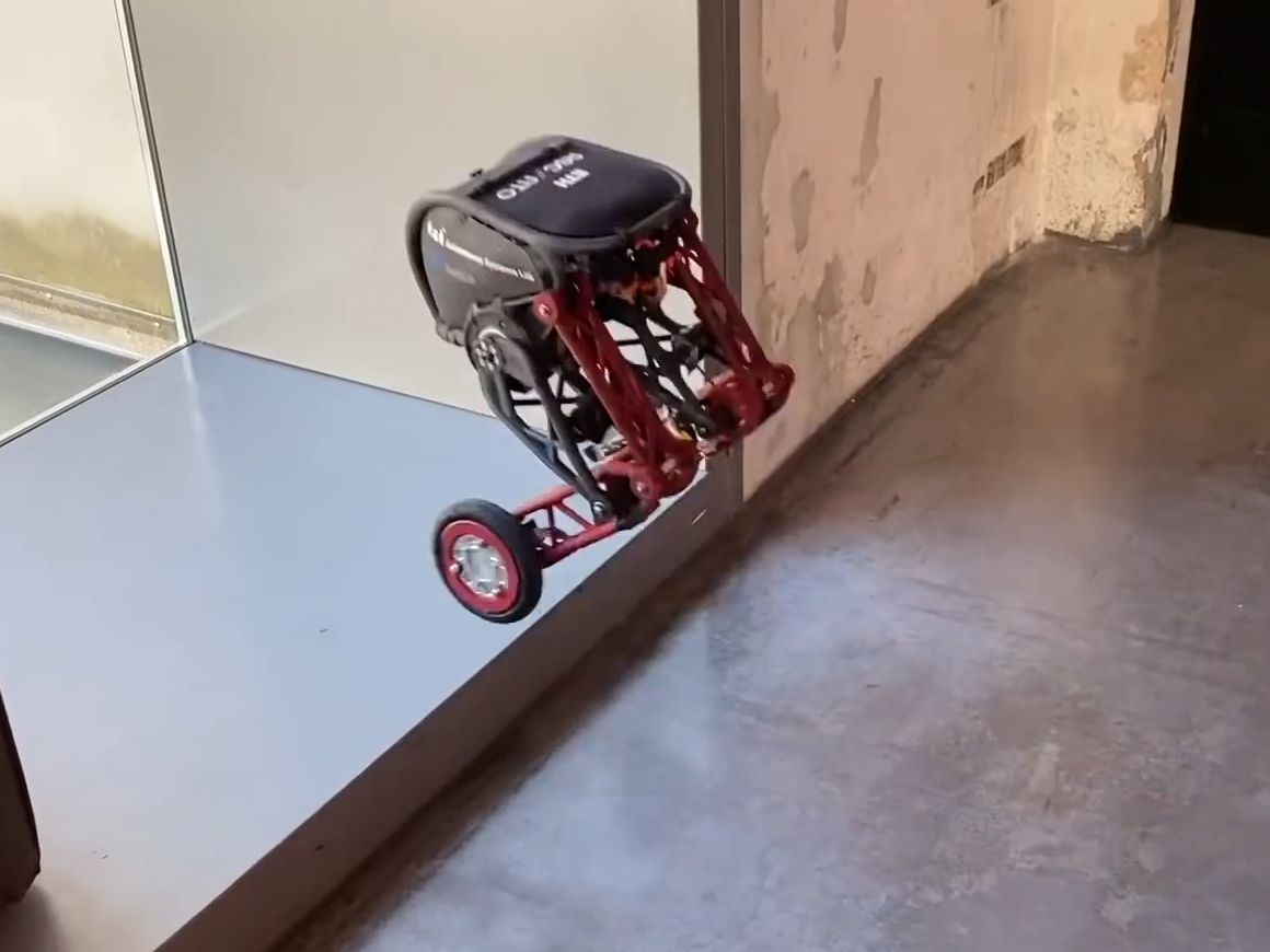 バネと高トルクモーターの力で収縮し、40cmの高さまでジャンプできるので、走行中に階段や障害物が現れたとして乗り越えられる。