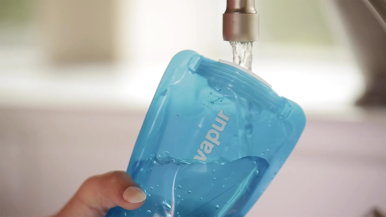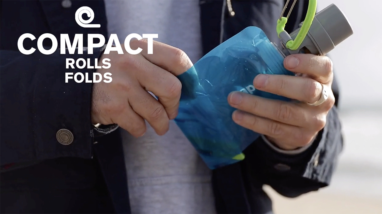 画期的な折りたたみ式デザインで、水を入れた状態だと垂直に立ち、使い切ったら折りたたんでコンパクトに収納可能。付属クリップでバッグやベルトに取り付けて運ぶこともできる。