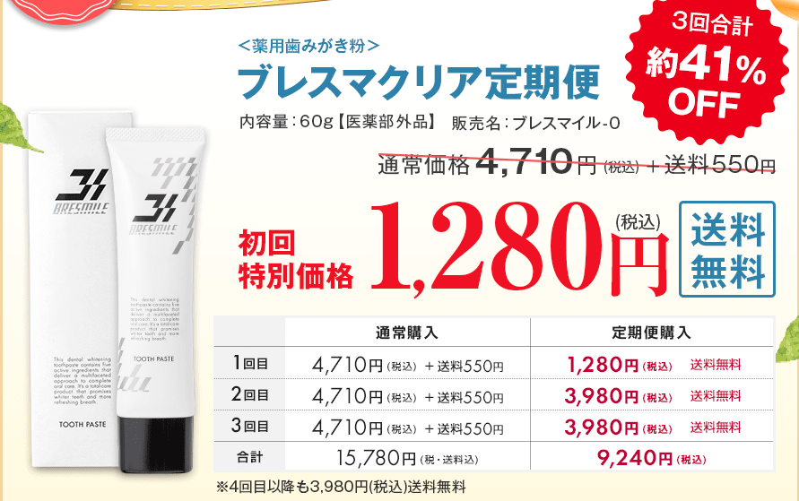 継続してブレスマイルクリアを使うなら、公式サイトの定期購入がおすすめ。定期コース「ブレスマクリア定期便」なら、初回限定価格として最初の1本は1,280円で購入可能。2本目からも3,980円で購入できるので、単品価格よりもお得です。3か月(3回受け取り分)のコストを計算しても、ホワイトニング歯磨き粉としては妥当な金額ではないでしょうか。