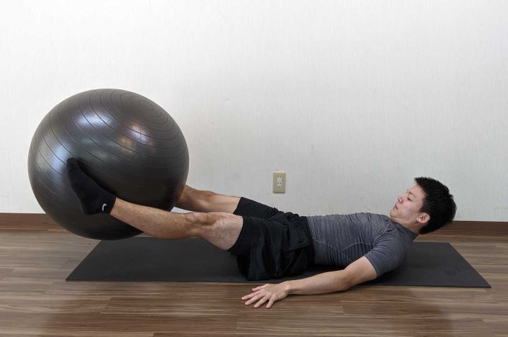 • バランスボールの上に寝ころび、膝は90度に曲げる。足の裏はしっかりと地面につける