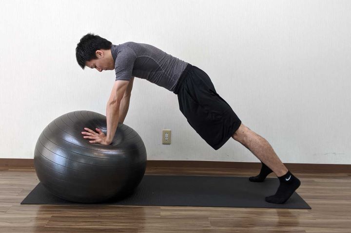 以下ではバランスボールの上に手を置いていますが、足を置いて行うのもおすすめですよ。