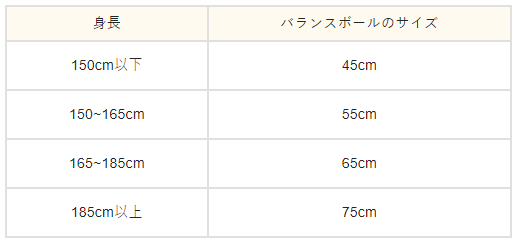 また、下記が身長とバランスボールのサイズの目安になるので、参考にしてください。