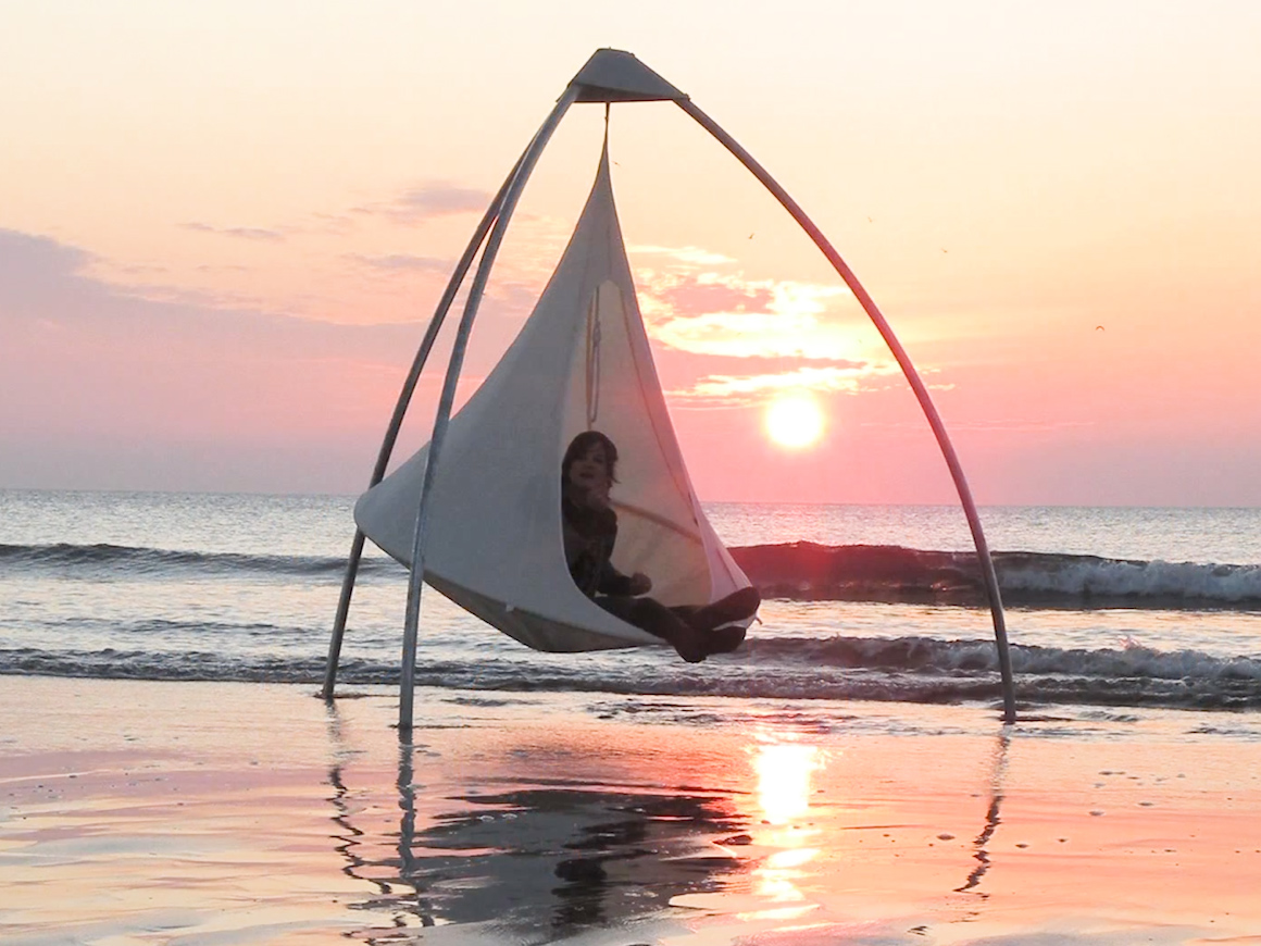 家の中に簡単にプライベート空間がつくれる、不思議な形状をしたテントが「CACOON」だ。キャンプに行った際にも、木などに吊るして使うことが可能。好きな場所に、ササッと設置でき、フワフワとリラックスできる空間がつくれるという。
