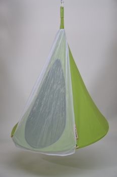 「CACOON」は家の中にある柱や、キャンプ先の木などに吊るして設置できる。耐荷重は、キッズサイズで100キログラム。シングルサイズとダブルサイズは、200キログラムだ。
