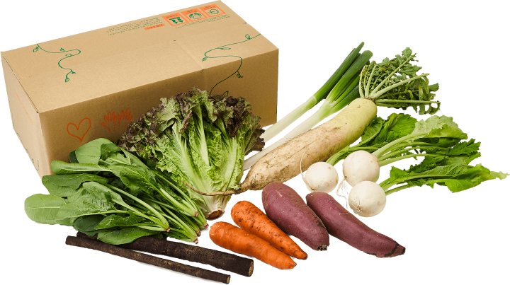野菜は大根・かぶ・ほうれん草・にんじん・さつまいも・サニーレタス・ねぎ・ごぼう・里芋など、時期によって異なるものが冷蔵で届きます。