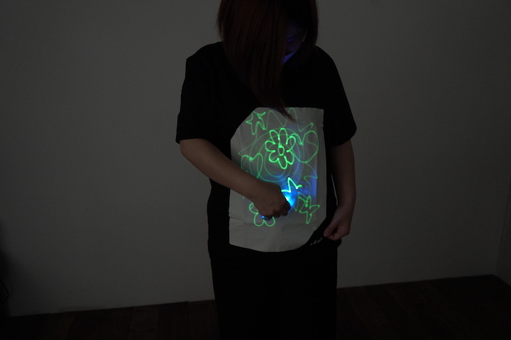 ライトを使って文字や絵などを書くことができるTシャツ。暗い場所で約5分間明るさが持続し、消えてしまってもスマホのライトなどですぐ書き足せます。