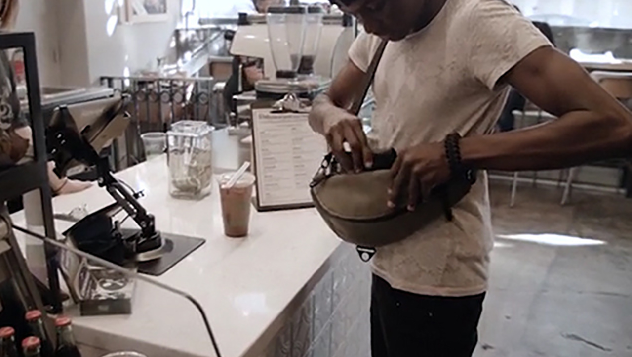 バッグは背中から前にすぐ移動できるので、支払い時のカードやお金の取り出しもスムーズ。