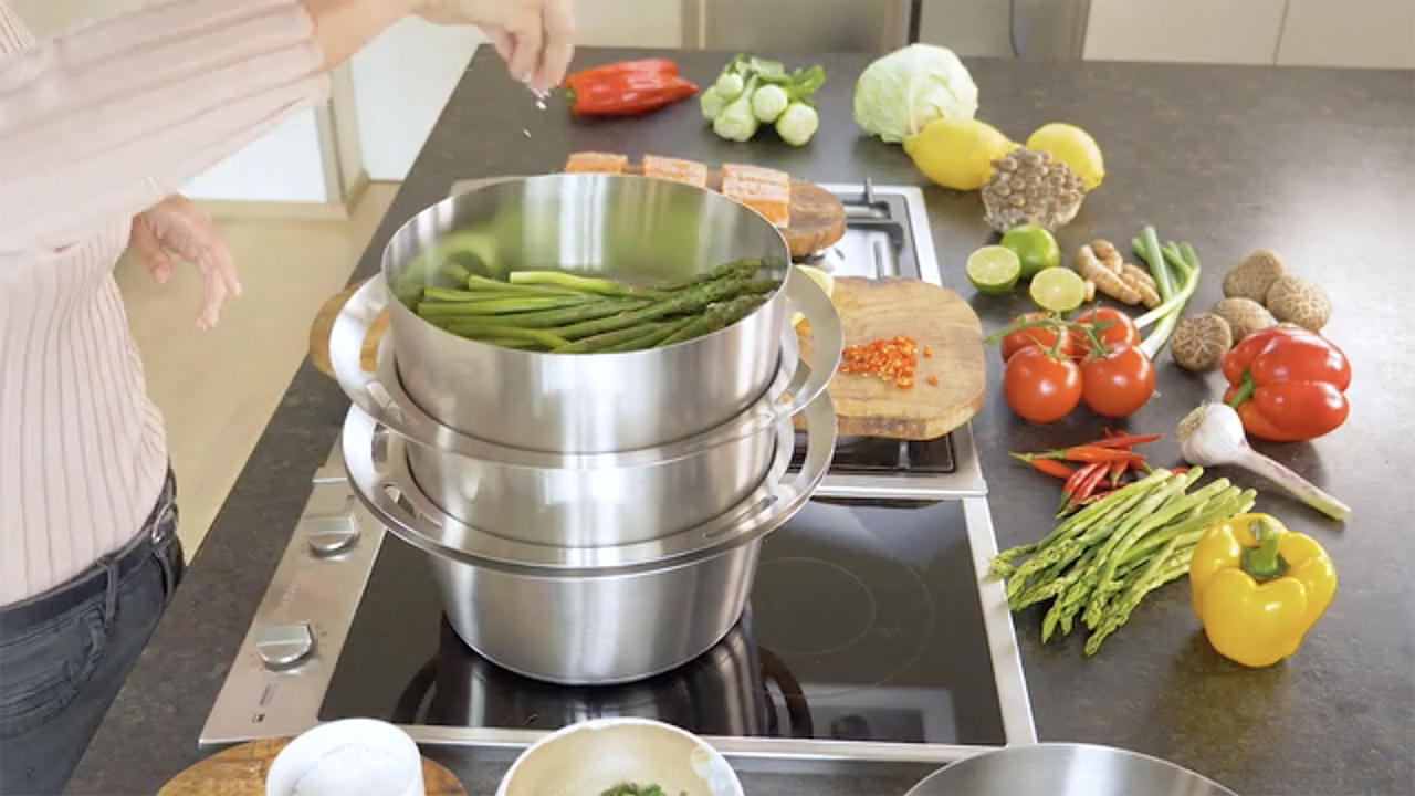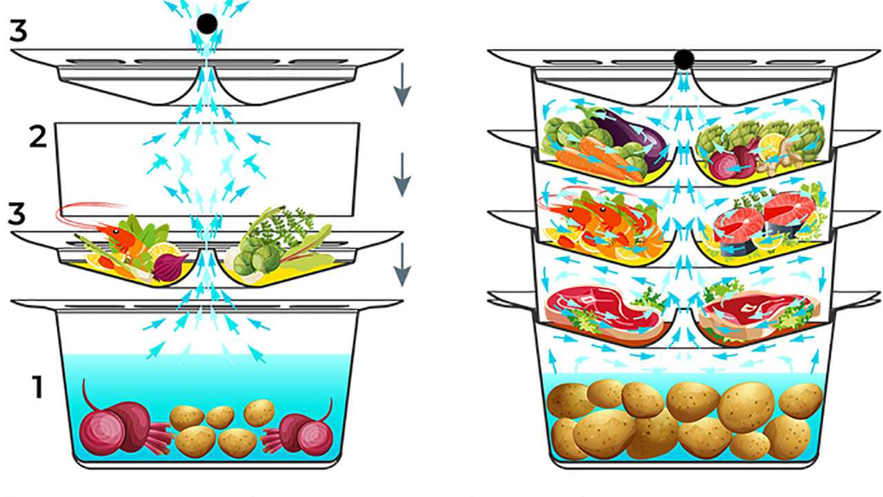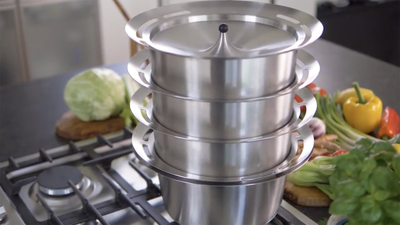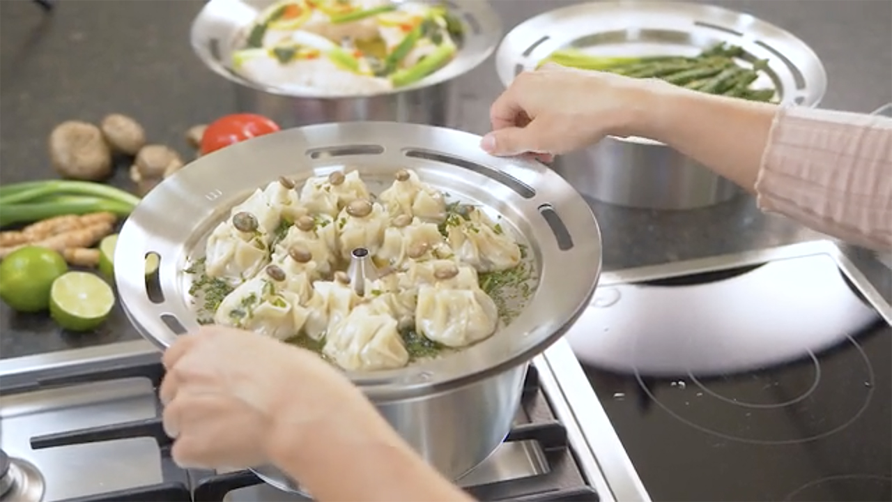 ヨーロッパのスタートアップが開発した「WULCANO」は、鍋に最大3層の蒸し器を積み重ねて4種類の料理を同時につくれるクッキングツール。熱源が一つでも、積み重ねて各層で異なる食材を同時に蒸すことができる。
