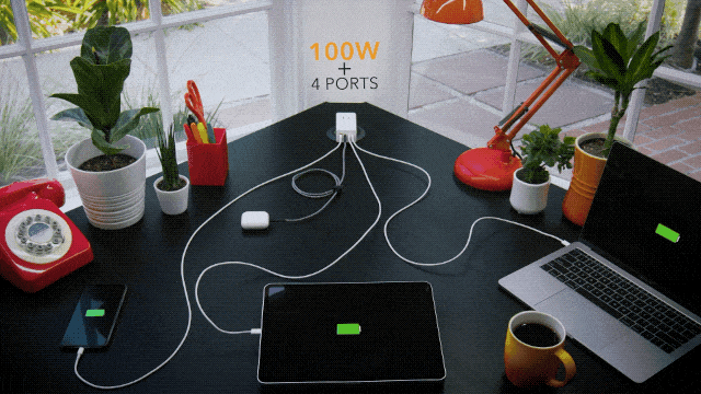 ノートパソコン、タブレット、スマートフォン、USBデバイスをすべて同時に急速充電できる。