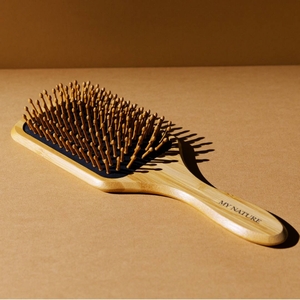頭皮マッサージに最適な、軽い竹素材のヘアブラシ。弾力あるクッションと先の丸い竹ピンが、頭皮に心地よい刺激を与え、血行を促します。静電気が起きにくく、ブラッシングによって髪に自然なツヤを与えます。シャンプー前のブラッシングにもおすすめです。
