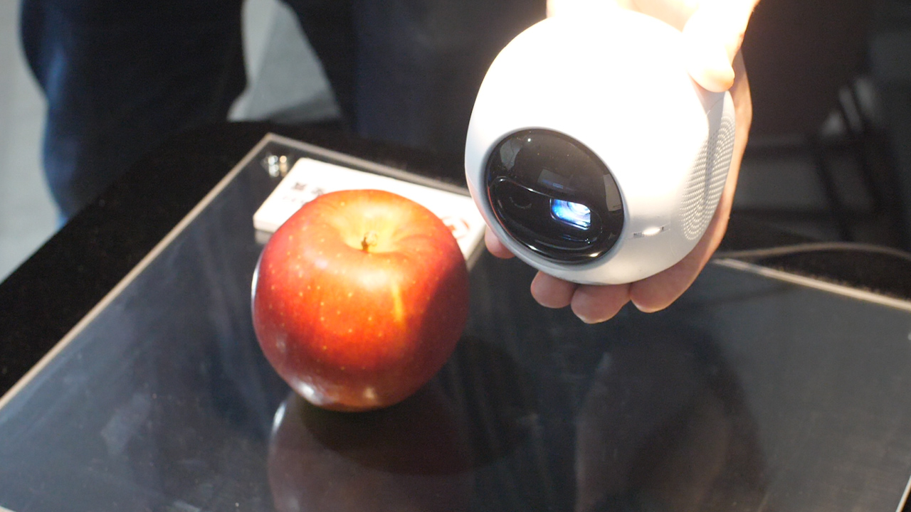 サイズは通常サイズのリンゴとほぼ同じで、重さは約380g。子どもでも両手で持ち運べる。また、「Astro」のプロジェクター光源に一定の距離で近づくと投影を一時的に停止するアイガード機能もついている。