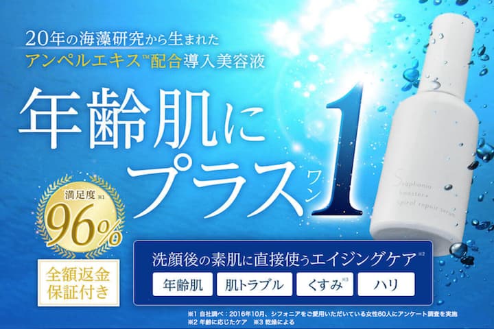海藻から海藻美容成分を抽出した美容エキス「シフォニアSRセラム」。洗顔後化粧水前につけることで、化粧水の浸透力を高める「導入美容液」としての働きを持っています。