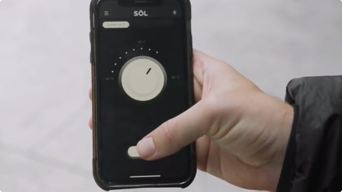 「SOL」は、カーボンファイバー製の加熱パネルを使って、すぐに温まれる加熱パネル内蔵ダウンジャケット。ボタン1つを3秒押し続ける、簡単操作で起動する。電源となる充電バッテリーは7.4Vの4000mAhで、最大8時間まで連続使用可能。低・中・高の三段階から温度が設定でき、最大50℃までジャケット内の温度を設定可能。さらに、専用アプリからも温度を細かく調節でき、スマートに温度管理ができる設計だ。