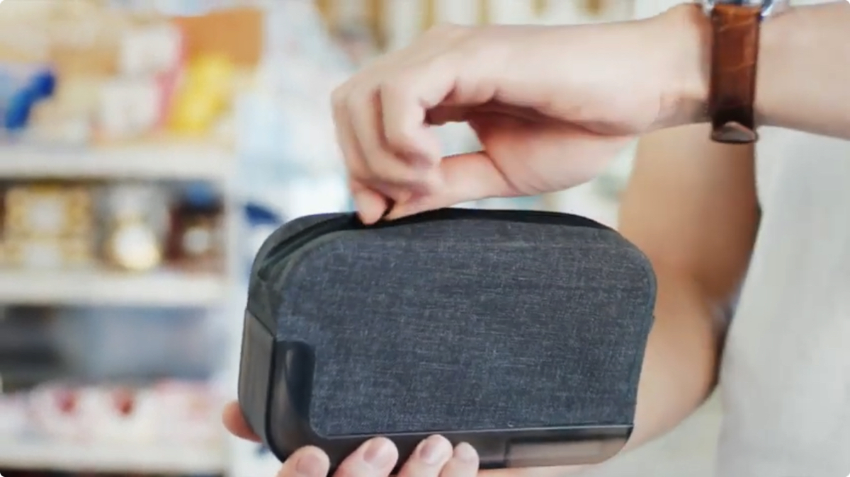 バッグはコンパクトながら、仕切りやポケットが多く収納性に優れている。片手に収まるサイズなので、外して持ち歩くときはクラッチバッグとして活躍できる。さらに表面は高周波を用いた特殊加工が施されているため、防水性にも優れている。予期せぬ雨でも荷物をしっかり守ってくれる設計だ。