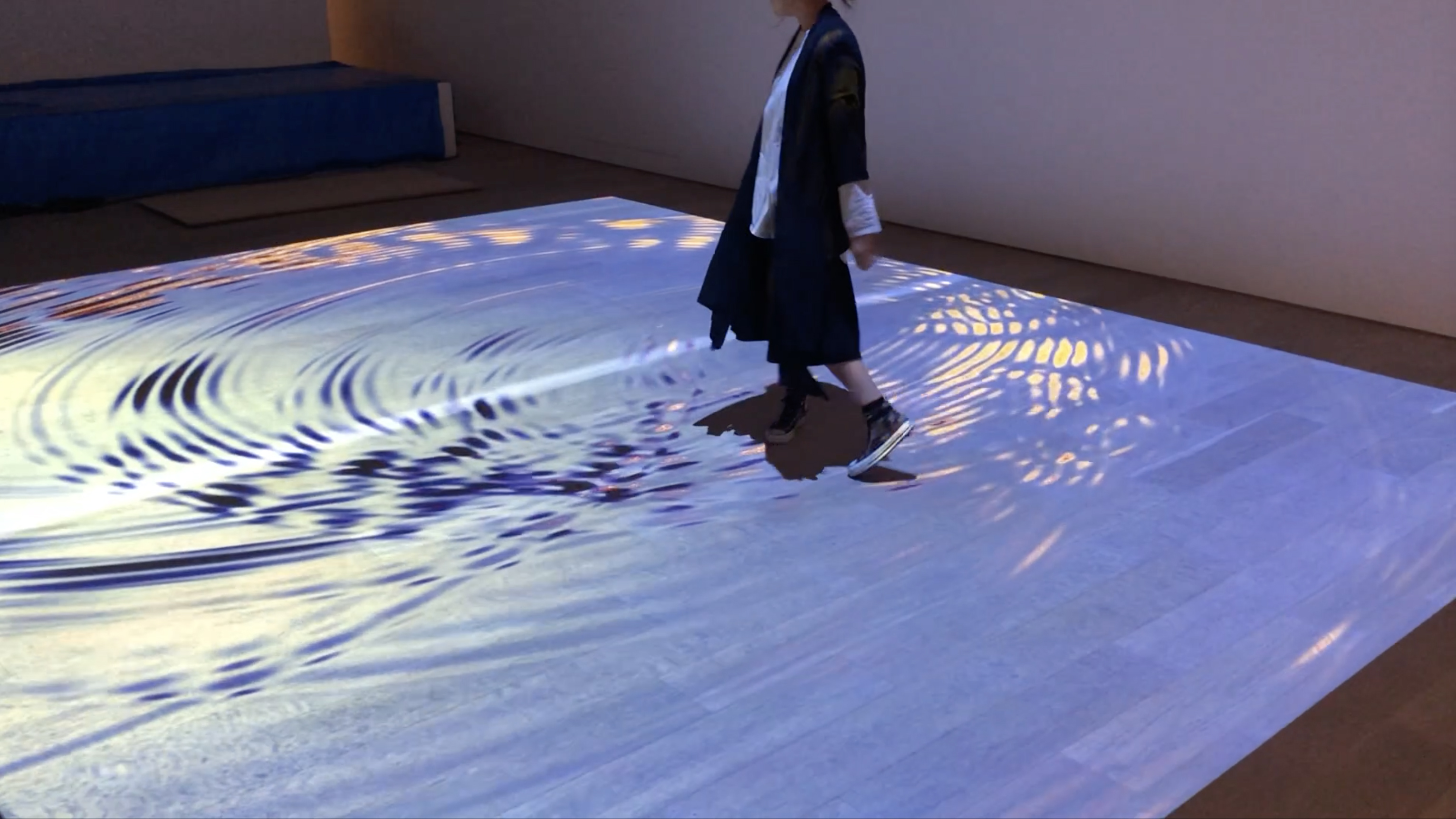 プロジェクションマッピングで映し出された水面に足を踏み入れると、まるで本物の水のように波紋が広がっていく。水面には何かの足跡も見えるが……