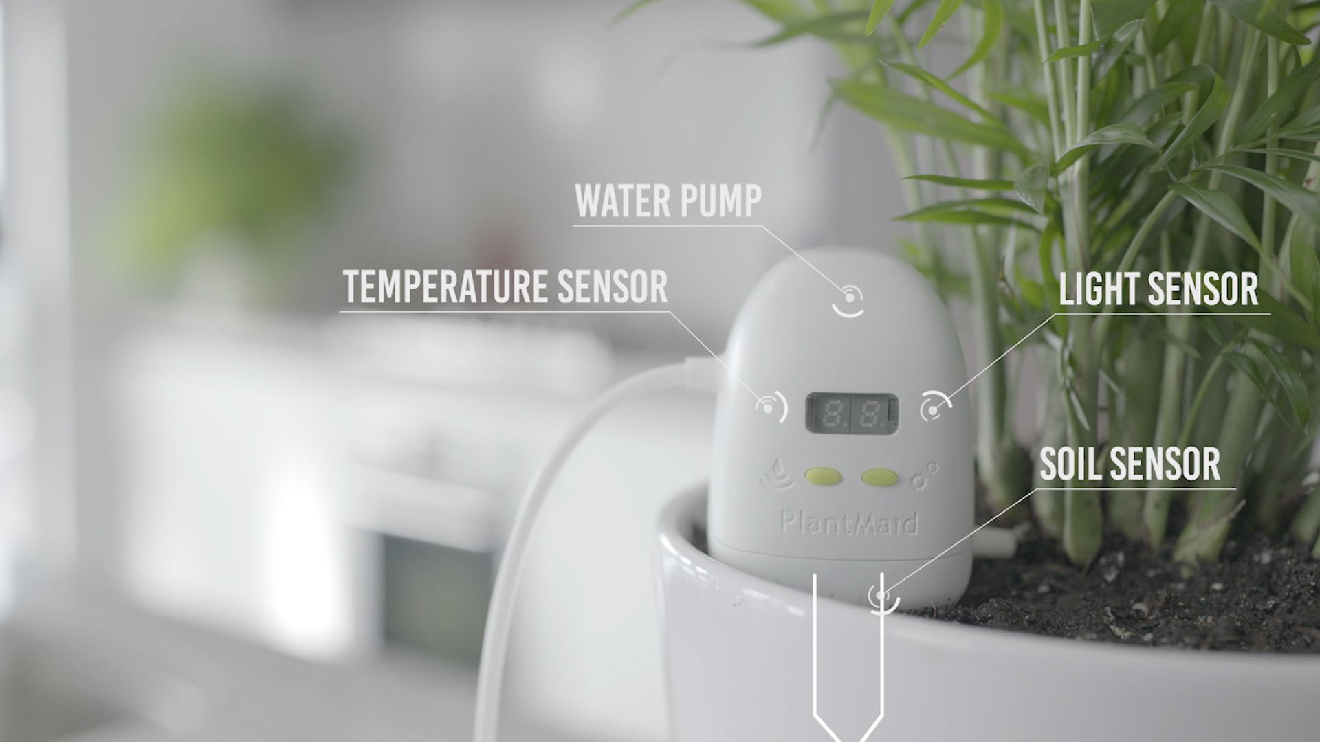 「PlantMaid」は土壌センサーと汲み上げ式のポンプ、光と温度のセンサーでお部屋の観葉植物のお世話を完璧にこなす。