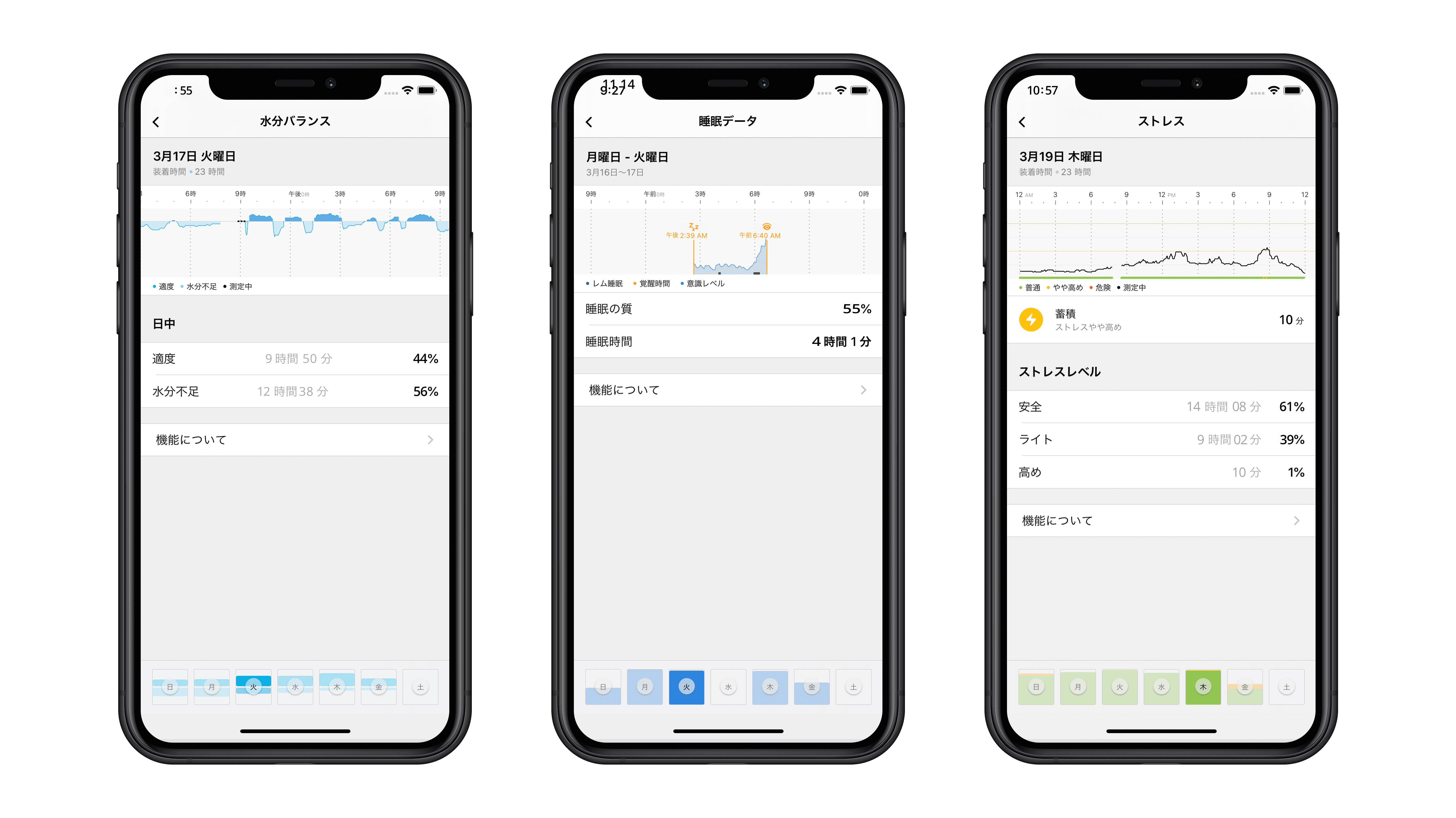 消費カロリー、エネルギーバランス、水分バランス、ストレスレベル、睡眠の質、脈拍、歩数と距離も自動計測され、これ一つつけているだけで様々な面から健康的なライフスタイルを目指しやすくなる。