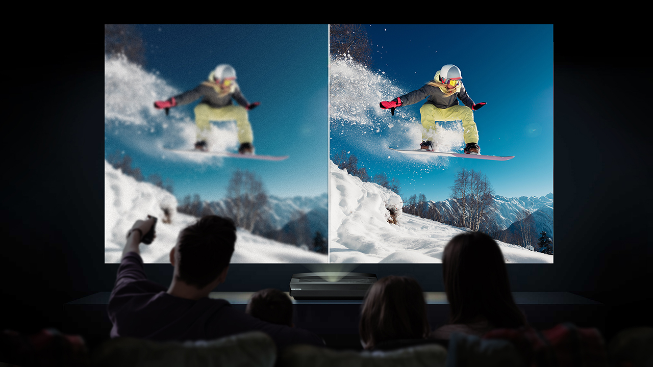 さらに「Polaris 4K Laser TV」は内部センサーで人との距離を検知し、人が近づきすぎると明るさを自動で下げてくれる。子どもがつい画面に近寄りすぎても安心だ。