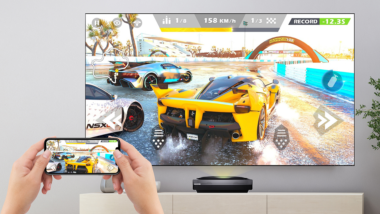 HDMIポート、USBポート、RCA入力、イーサネット入力を備え、Bluetooth対応オーディオ製品とのペアリングも可能。さらにMiracastを通じて、対応デバイスからワイヤレスミラーリングが利用でき、スマホゲームを大画面で没入感たっぷりに楽しむこともできる。