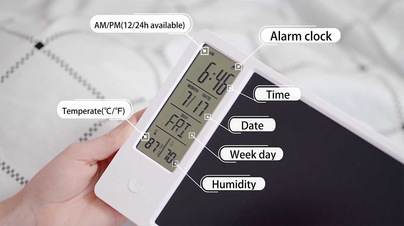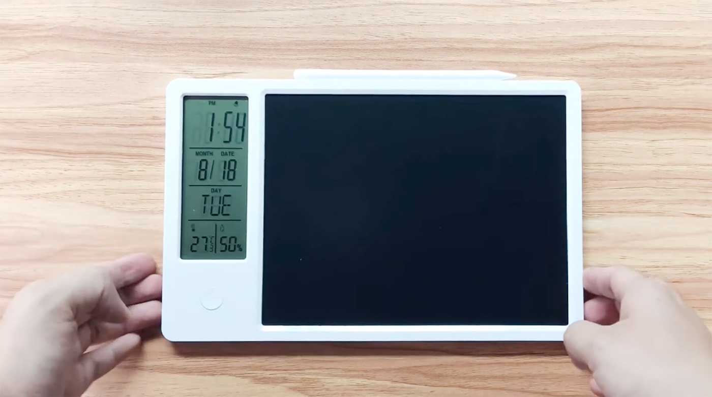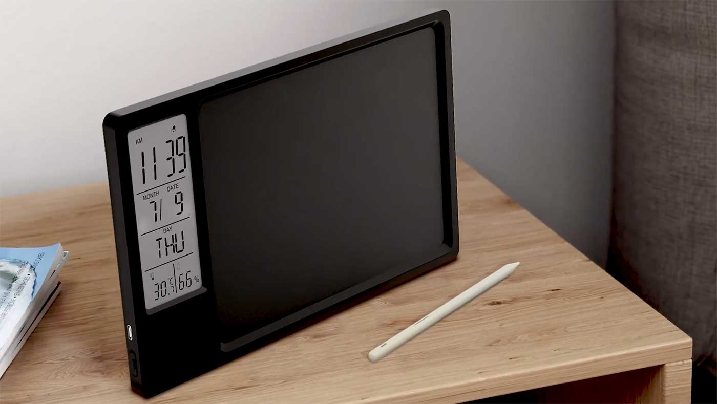 何度でも書いたり消したりできて、省電力でバッテリー長持ち。また温度計・湿度計を搭載することで、その場の快適度もチェックできる。地球環境とユーザーの健康を考えたアイテムだ。