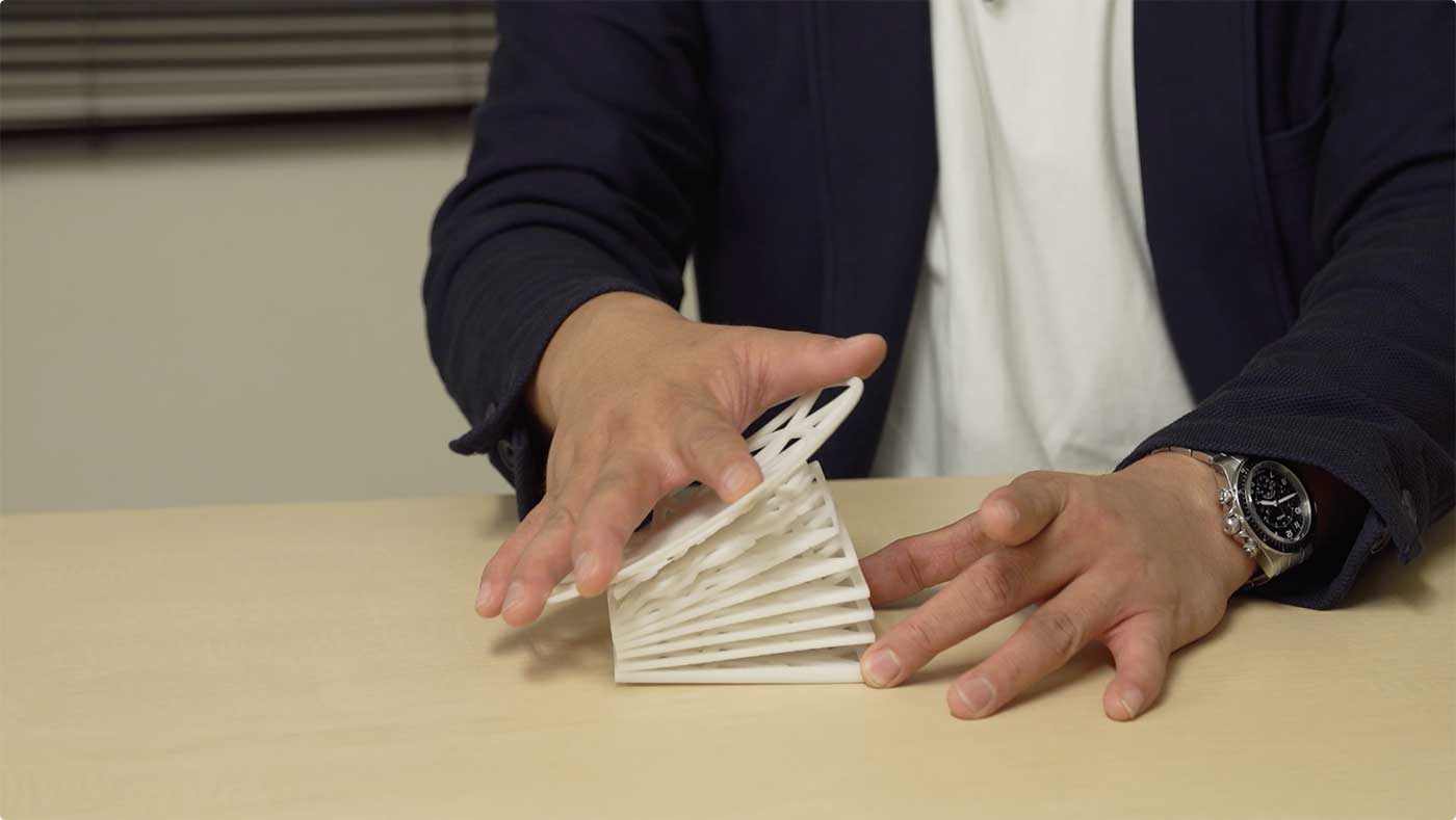 幾何学的な構造にすることで柔軟性や弾力性が生まれ、頭の重みをしっかり支えながら、頭の動きに対しては抵抗なくスムーズに動くようになっている。