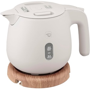 ころんとした丸みを帯びたボディと、淡いくすみカラーが印象的な象印の電気ケトル。温かみがあり、かわいらしく、暮らしにすっとなじむデザインです。木目調の電源プレートで、ナチュラルな雰囲気を演出します。容量は0.6Lと0.8Lの2種類があり、一人暮らしにちょうどいい大きさ。消費電力は1300Wとハイパワーなので、満水でも短時間で沸騰します。また、安全機能も充実していて、本体二重構造や蒸気セーブ構造など、やけどしにくい設計となっています。注ぎ口ほこりブロックやAg+抗菌加工といった、清潔に使える工夫も魅力です。