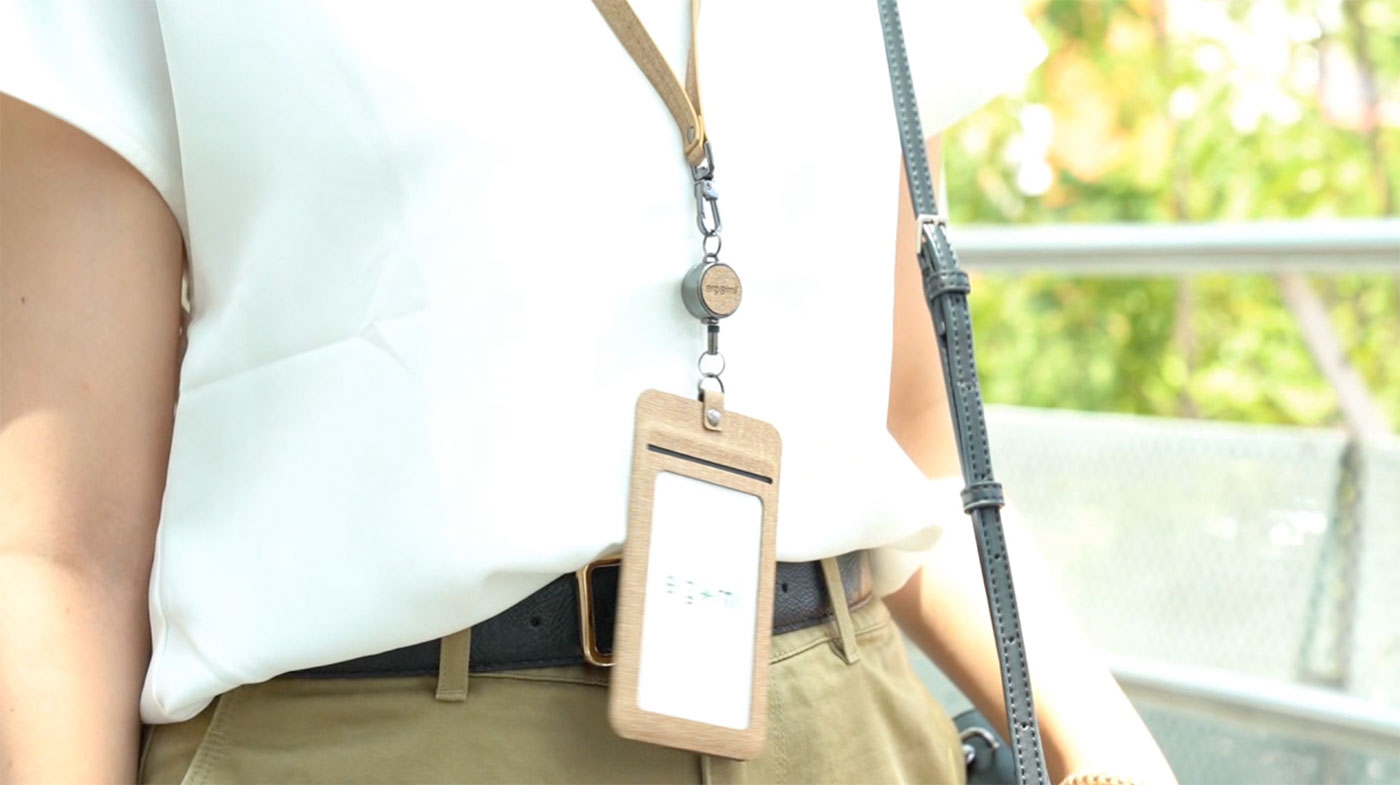 普段は首にぶら下げるカードホルダー。引っ張ると最大35cmまで伸びるリールが付属しており、社員証や交通系ICカードなどを素早くタッチできる。