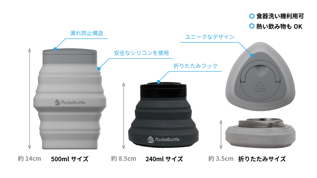 Pocketbottleは、500ml容量ながら、折りたたむと厚さ3.5cmと圧倒的にコンパクトになるのが特徴。