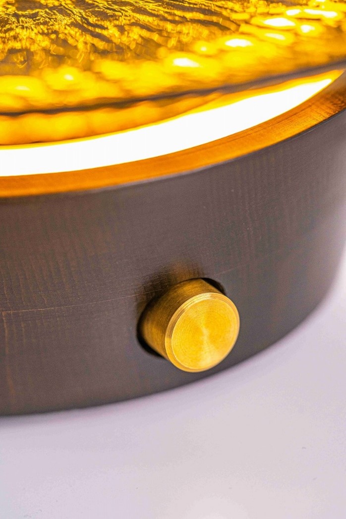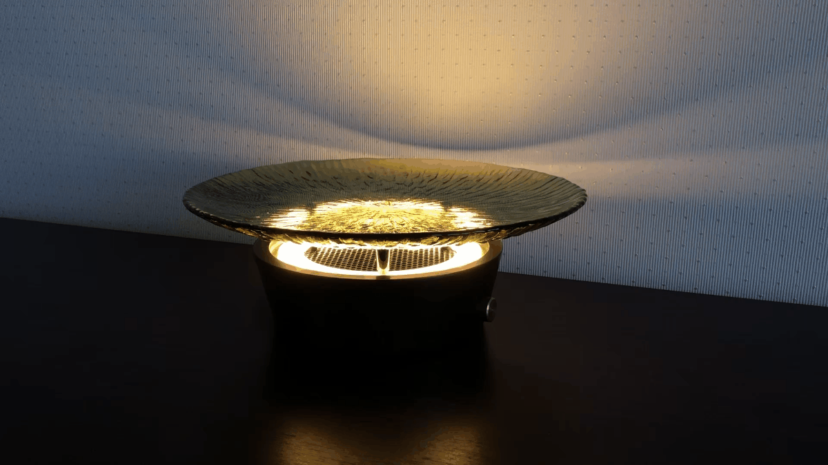 スピーカーの上部のガラスが拡散板、ディフューザーとしての役割を果たす。ガラス面をふるわせながら、空間全体に音楽だけでなく、LEDの光をゆらゆらと360度方向に広げるのだ。
