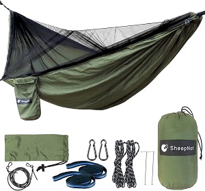 蚊帳一体型のハンモックなので、広げると蚊帳も同時に展開。蚊帳を吊るす場所がないベランダでも虫よけしやすいです。