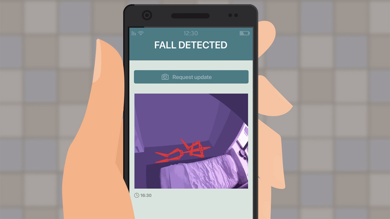 ユーザーの転倒を検知すると、まずAIがスピーカーから「倒れましたか?」と呼びかける。返答が「いいえ」以外の場合は緊急と判断し、あらかじめ登録しておいた緊急時連絡先にアラートを発信する。