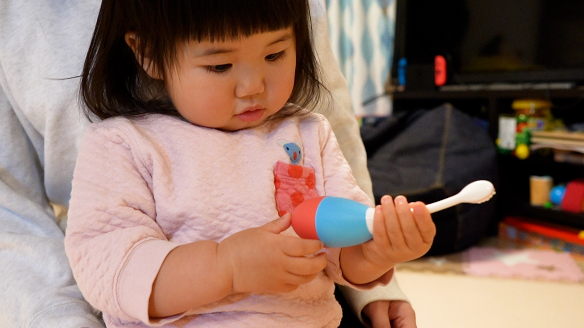 歯に当たると音楽が聴こえるふしぎな体験に直立不動!まったく動かず、今までにないほど歯磨きをさせてくれました。最後にはもっと磨きたいと泣き出すほど気に入った様子。