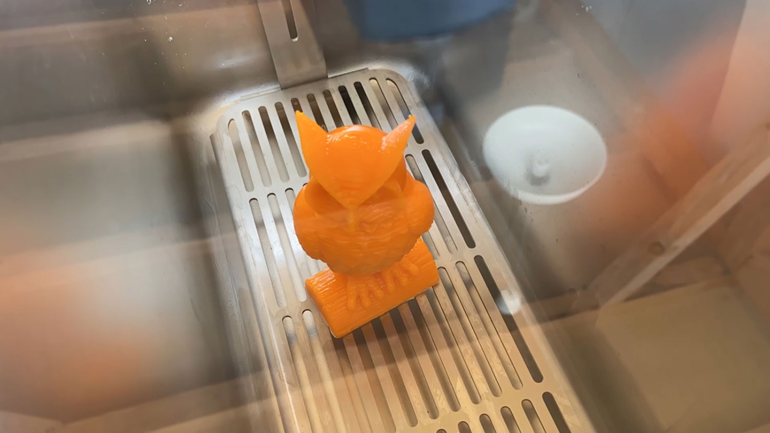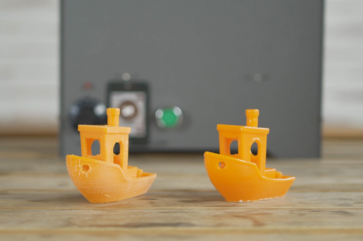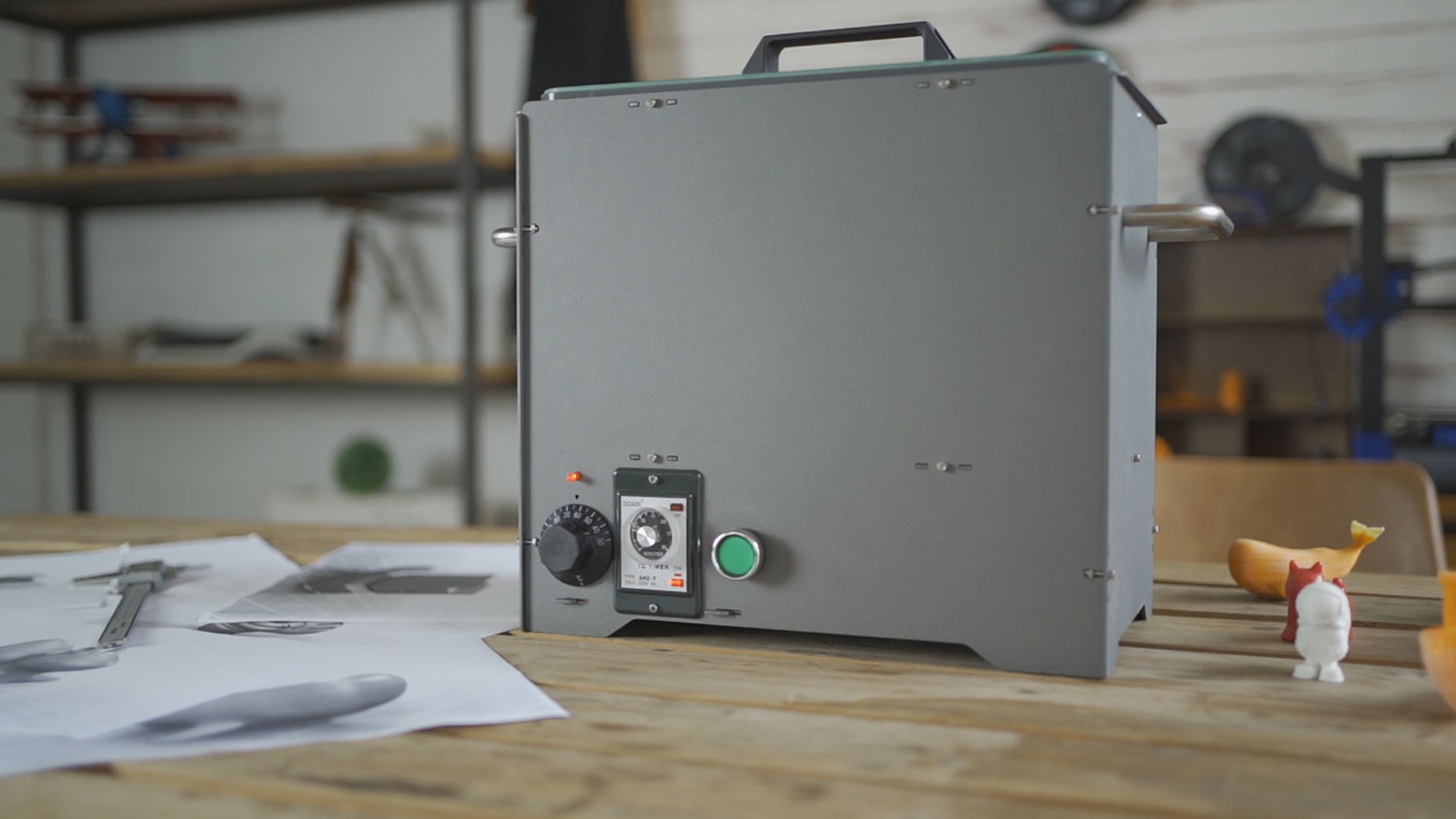 造形物と専用の溶剤を中に入れて、内部温度とタイマーとセットする。スイッチをONにすると「PolySmoother」内が温まり、その熱によって蒸発した溶剤が造形物を包み込み、ザラザラだった表面を「ほんの少しだけ溶かす」というアプローチで滑らかにする。