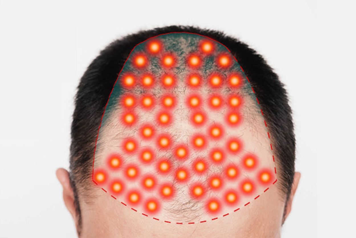 薄毛や抜け毛が最も発生しやすいところをターゲットにするため、おでこの生え際のM字部分や、頭部の中央部分に集中的に配置されている。