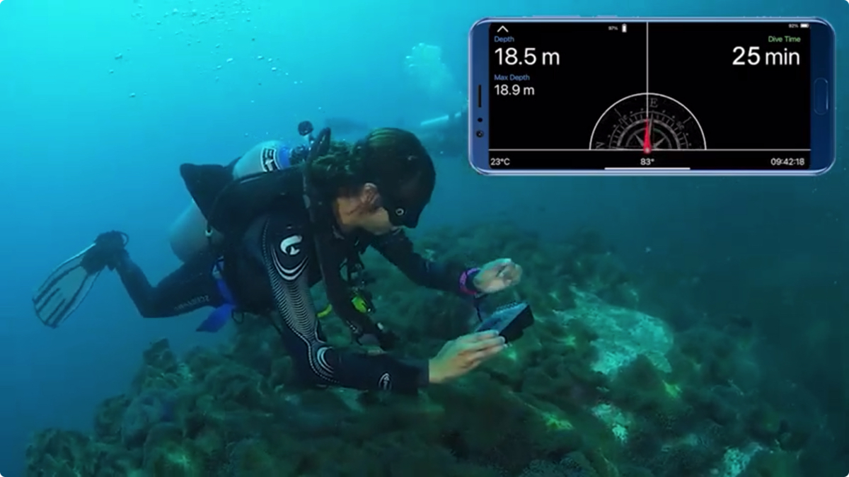 "ダイコン"とはダイブコンピュータの略で、リアルタイム深度、ダイビング時間、上昇速度、温度など、ダイビングする上で大切な情報を測定し、減圧症のリスクを減らしてくれるものだ。深度を5段階でアラートしてくれ、上昇する時間もリマインドしてくれる。