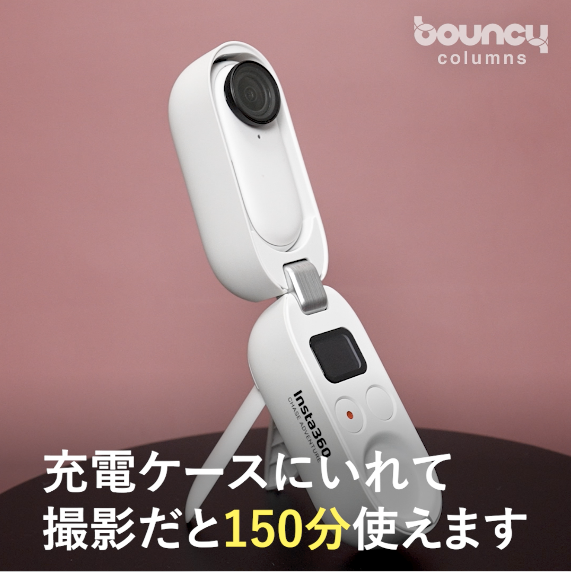 本体のみで使うと15分ほどでバッテリーが切れますが、充電ケースにいれながら使うと約150分に延びます。充電ケースを握って使うこともできますし、立てかけて使うことも。三脚ネジ穴もあるので、自撮り棒なども装着可能です。