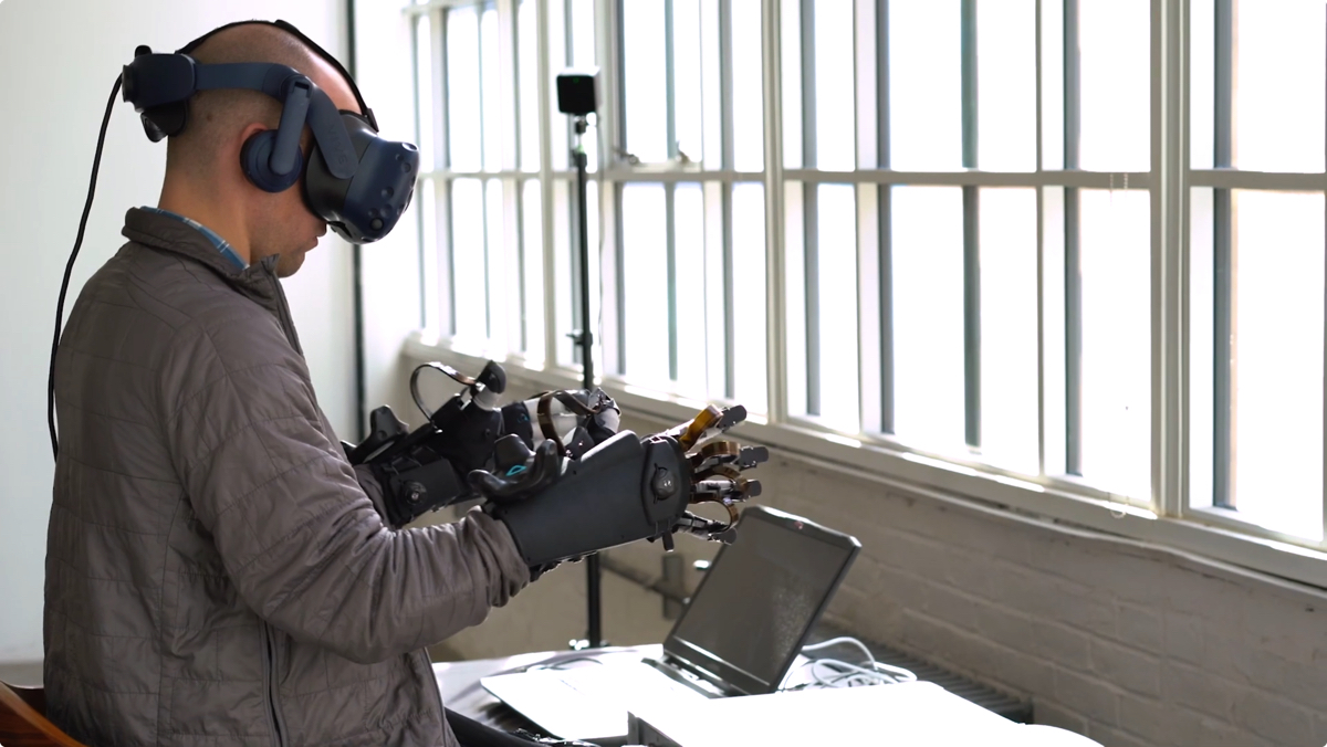 グローブの外骨格は空気圧によって負荷がかかり、VR空間でのリアルな触覚を実現している。片手あたり最大18キロまで抵抗力を与えられるので、マイクロ流体スキンと組み合わせてよりリアルに触覚を再現している。